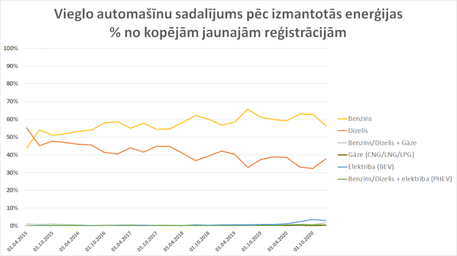 Jauno vieglo automašīnu sadalījums pēc enerģijas avota