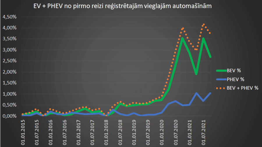 EV + PHEV no pirmo reizi reģistrētajām vieglajām automašīnām