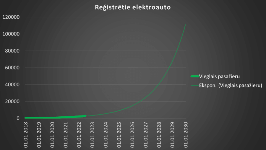 Reģistrētie elektroauto Latvijā un tendences līkne no 2018. gada